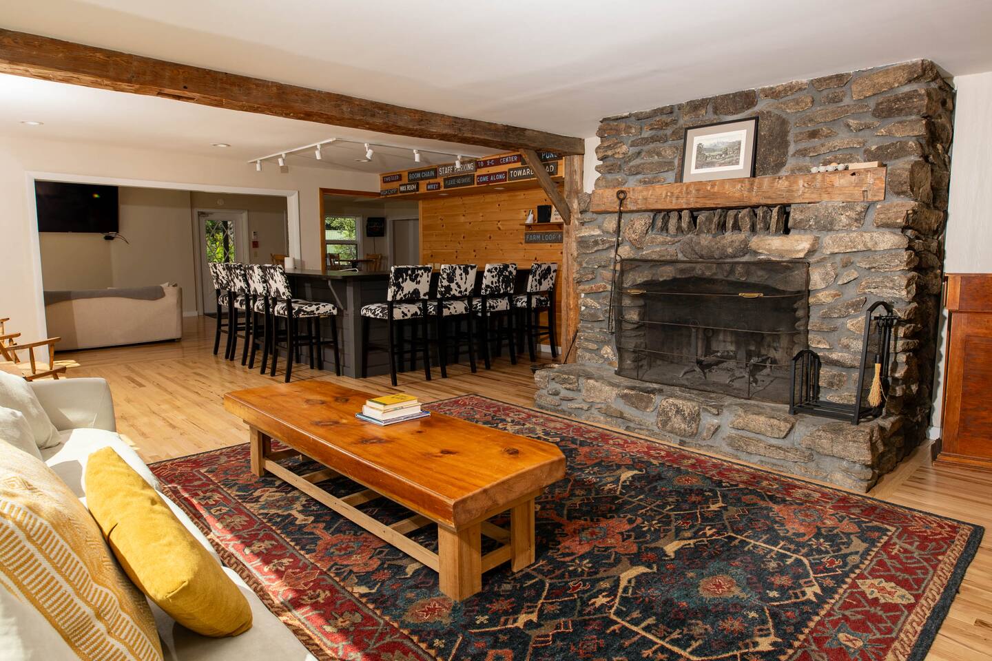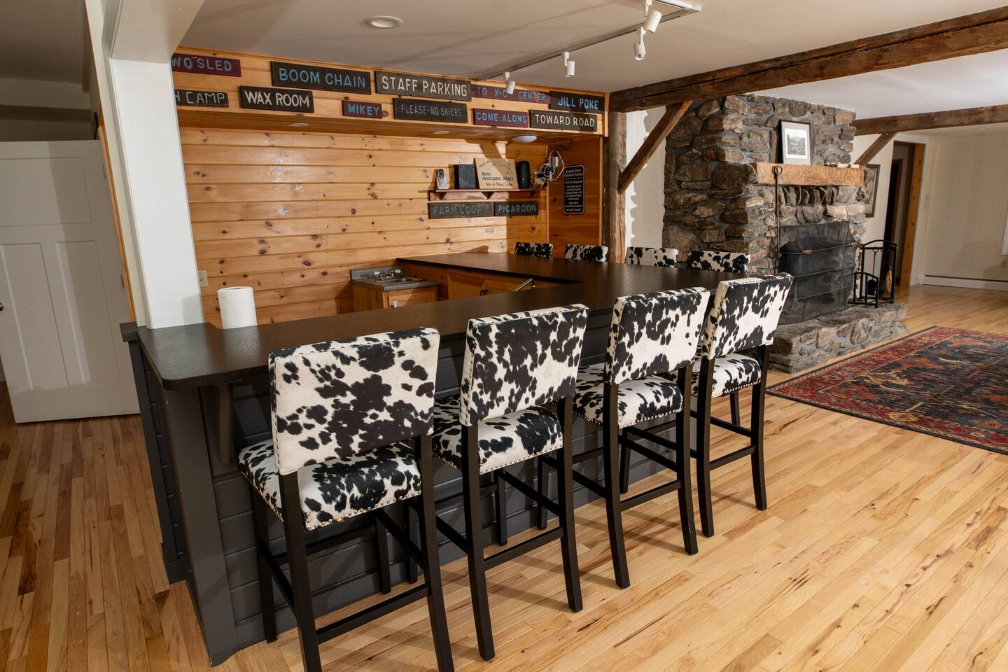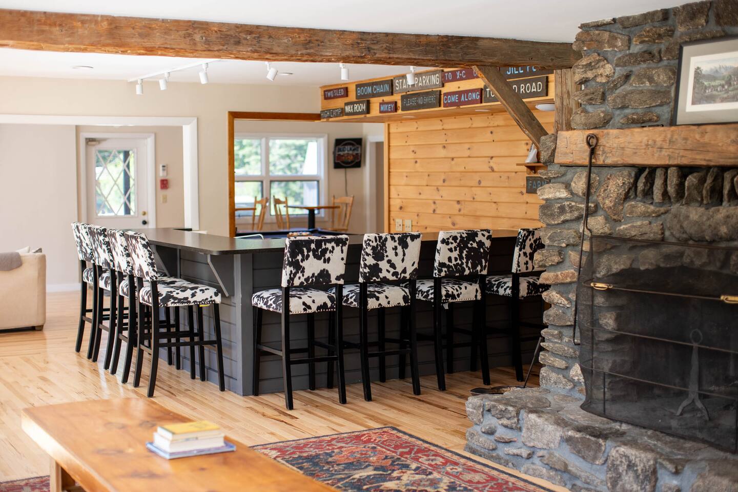The View Complementing the impressive renovations made to the Meeting Haus is the incredible view its location provides. Large west-facing picture windows frame the sun as it sets behind the peaks at the Sunday River Ski Resort. Settle into the inviting sofa with the fire roaring in the large river stone fireplace and soak in the scene with a glass of mulled wine. The Heart of the Haus Sure to thrill and inspire all culinary artists, the beautiful and modern chef’s kitchen is fully equipped to create masterpieces that keep your group fueled for adventure. Fire up the griddle on the enormous 6-burner range and line it up with some French toast and eggs to rouse the rest of the group and serve it up at the breakfast bar or in the large dining area. The kitchen is open to one of the main lounge areas so none of the action is missed by those doing the cooking. If you don’t feel like cooking during your stay, ask about the many catering options in the Bethel area. Comfortable Accommodations The nine bedrooms previously making up the accommodations for the former Sunday River Inn have been spruced up and updated, keeping the cozy vibe of the Inn intact. The previously shared bathroom has been converted into two spacious, updated bathrooms, totaling three large full bathrooms. Several lounge areas provide a space for everyone’s needs. Snuggle up into one of the comfy lounge chairs in front of the fire with your favorite book. Or scratch that competitive itch in either of two game rooms. Wrap up the day with a cold one at the Meeting Haus’s own private Après Ski Bar. Whatever your reason for visiting, The Meeting Haus has the flexibility to make your stay comfortable and memorable.
