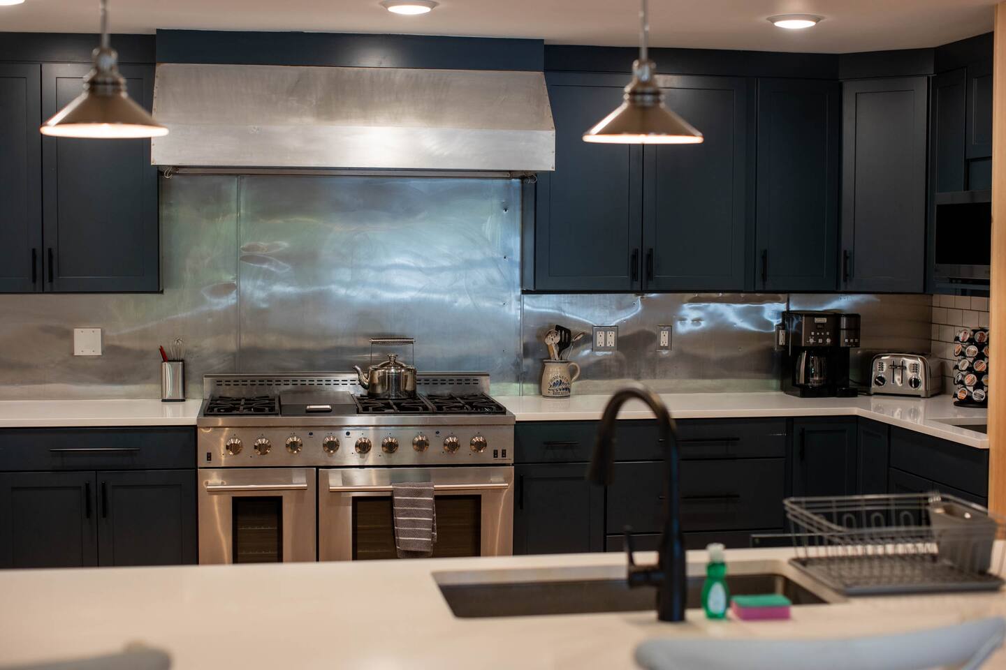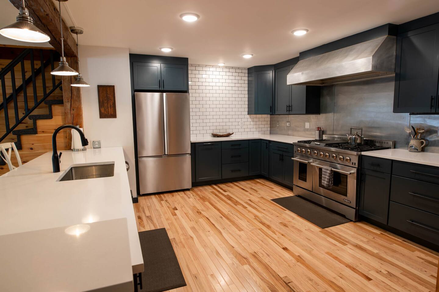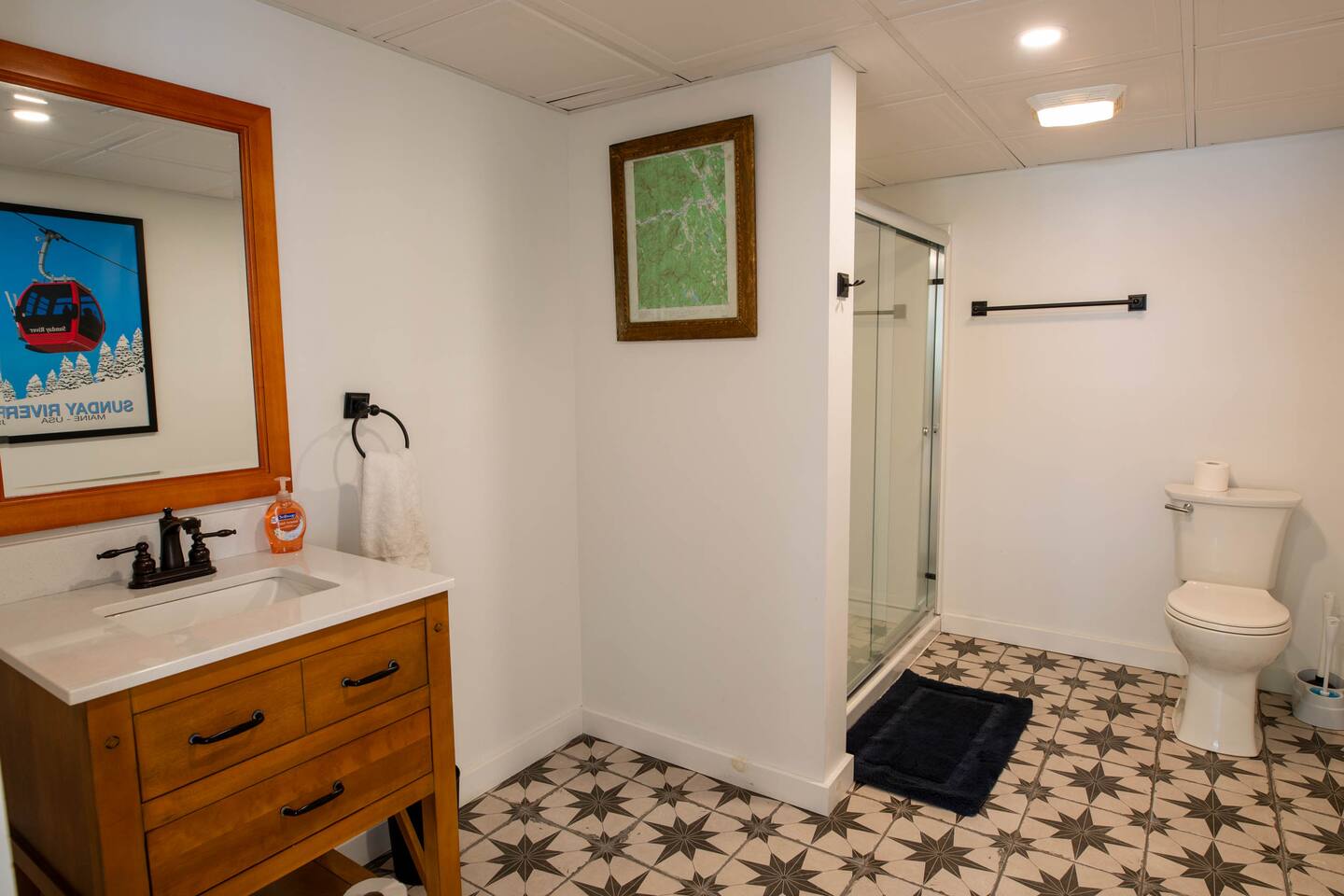 The View Complementing the impressive renovations made to the Meeting Haus is the incredible view its location provides. Large west-facing picture windows frame the sun as it sets behind the peaks at the Sunday River Ski Resort. Settle into the inviting sofa with the fire roaring in the large river stone fireplace and soak in the scene with a glass of mulled wine. The Heart of the Haus Sure to thrill and inspire all culinary artists, the beautiful and modern chef’s kitchen is fully equipped to create masterpieces that keep your group fueled for adventure. Fire up the griddle on the enormous 6-burner range and line it up with some French toast and eggs to rouse the rest of the group and serve it up at the breakfast bar or in the large dining area. The kitchen is open to one of the main lounge areas so none of the action is missed by those doing the cooking. If you don’t feel like cooking during your stay, ask about the many catering options in the Bethel area. Comfortable Accommodations The nine bedrooms previously making up the accommodations for the former Sunday River Inn have been spruced up and updated, keeping the cozy vibe of the Inn intact. The previously shared bathroom has been converted into two spacious, updated bathrooms, totaling three large full bathrooms. Several lounge areas provide a space for everyone’s needs. Snuggle up into one of the comfy lounge chairs in front of the fire with your favorite book. Or scratch that competitive itch in either of two game rooms. Wrap up the day with a cold one at the Meeting Haus’s own private Après Ski Bar. Whatever your reason for visiting, The Meeting Haus has the flexibility to make your stay comfortable and memorable.