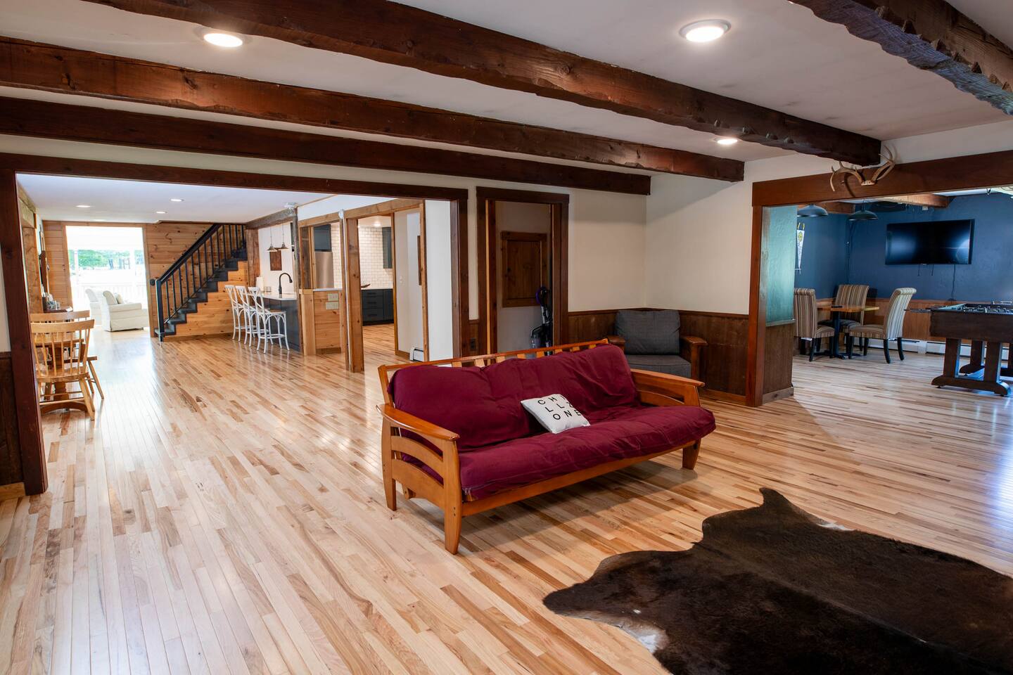 Experience The Meeting Haus, a 6100 sq ft haven in Skiway Lodges. Once the main inn, now awe-inspiring. Comfortably hosts 22+ guests, ideal for larger groups seeking a home away from home in Maine's beauty. Just half a mile from lifts, and 1 Mile from the Golf Course, It's the ultimate Sunday River rental. Embrace the former Inn's legacy with family and friends.